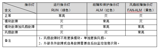 整流模块面板的三个指示灯联合起来可以指示模块运行和故障状态,其意义如下表所示: