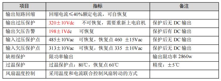 模块具有输出过压保护欠压告警功能。当输出电压大于 320±10Vdc 时,模块保护,无直流输出,保护指示灯(红色)亮。模块不能自动恢复,必须将模块断电后重新上电。