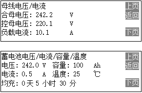 在主菜单屏按<1>键查看系统当前交流、直流和电池组数据:
