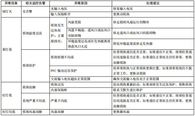 直流屏整流模块R48-3000E3故障时指示灯如下:电源指示灯(绿色)灭,保护指示灯(黄色)亮,保护指示灯(黄色)闪烁,告警指示灯(红色)亮,告警指示灯(红色)闪烁。表 2 列出了可能的原因和纠正措施。